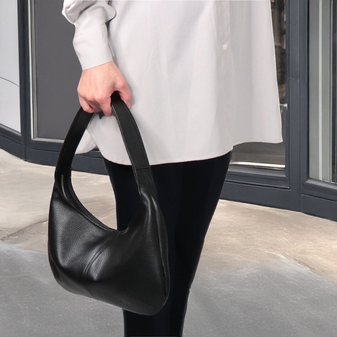 あえてマチを設けず、荷物を入れたときに自然に生まれる曲線で、中身をやさしく包み込み、落ち着いた印象に仕上げています。